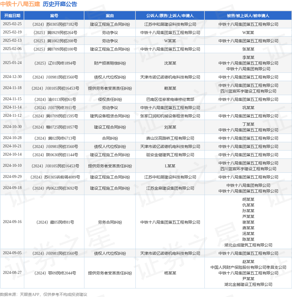 本站消息,根据天眼查APP显示,近日公布了一则中铁十八局集团第五工程有限公司作为被告/被上诉人的开庭公告,详细内容如下: